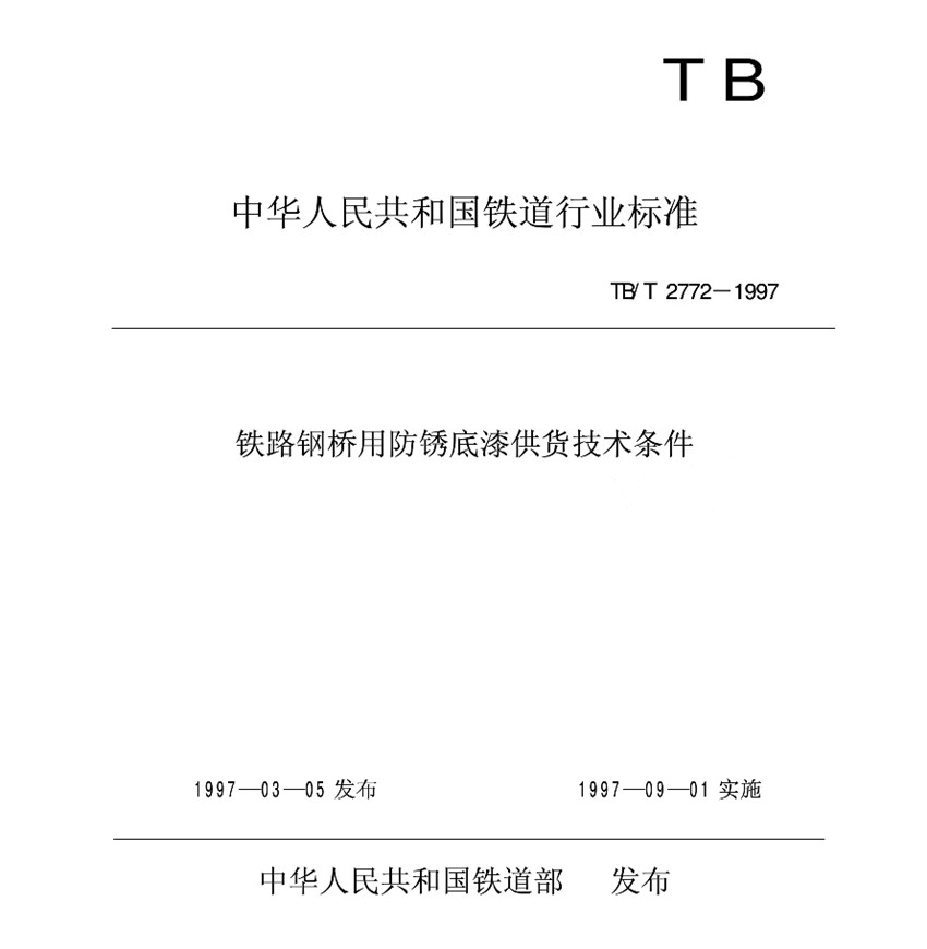 TB/T 2772-1997鐵路鋼橋用防銹底漆供貨技術(shù)條件標(biāo)準(zhǔn) TB 中華人民共和國鐵道行業(yè)標(biāo)準(zhǔn) TB/T 2772-1997鐵路鋼橋用防銹底漆供貨技術(shù)條件 1997-03-05發(fā)布 1997-09-01實(shí)施 中華人民共和國鐵道部 發(fā)布 本標(biāo)準(zhǔn)規(guī)定了鐵路鋼橋各涂裝體系防銹底漆的產(chǎn)品分類、技術(shù)要求、試驗(yàn)方法、檢驗(yàn)規(guī)則及包裝、標(biāo)志、運(yùn)輸和貯存。本標(biāo)準(zhǔn)適用于新建鋼梁涂裝和運(yùn)營中鋼梁重新涂裝及維護(hù)涂裝使