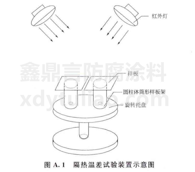A.3.2、試驗(yàn)在18℃—27℃的環(huán)境條件下進(jìn)行。在旋轉(zhuǎn)托盤上放置圓柱體筒形樣板架,圓柱體筒形樣板架的中心應(yīng)對(duì)準(zhǔn)托盤上圓孔的中心;將1塊試板及1塊空白試板放在圓柱體筒形樣板架上,兩塊板之間間隔5mm,試板有涂層的面向上,空白試板經(jīng)過噴砂或拋丸的面向上;在旋轉(zhuǎn)托盤的上方0.5m處,安裝2只紅外燈,紅外燈與旋轉(zhuǎn)托盤邊緣的水平距離為15cm,紅外燈的加熱面軸向與試板平面成75°。