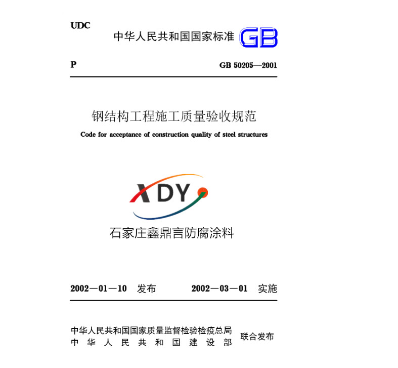 本文介紹了GB50205-2001鋼結(jié)構(gòu)工程施工質(zhì)量驗(yàn)收規(guī)范對(duì)于鋼結(jié)構(gòu)防腐涂料涂裝的表面處理要求,各類防銹漆、底漆對(duì)應(yīng)的最低除銹等級(jí)及防腐涂料的涂層厚度、驗(yàn)收標(biāo)準(zhǔn)。專業(yè)的XDY鋼結(jié)構(gòu)防腐漆生產(chǎn)廠家石家莊鑫鼎言防腐涂料廠為您提供質(zhì)量?jī)?yōu)異,價(jià)格合理的XDY鋼結(jié)構(gòu)防腐涂料全系列產(chǎn)品。