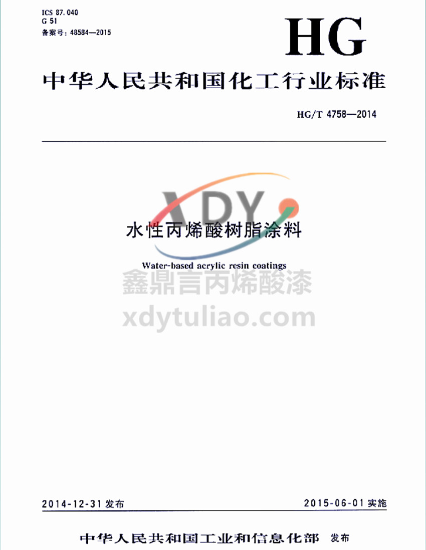 水性丙烯酸樹脂涂料化工行業(yè)標準HG/T 4758-2014